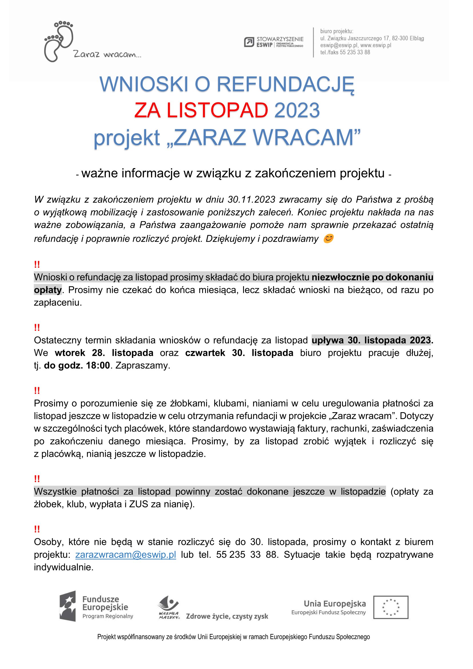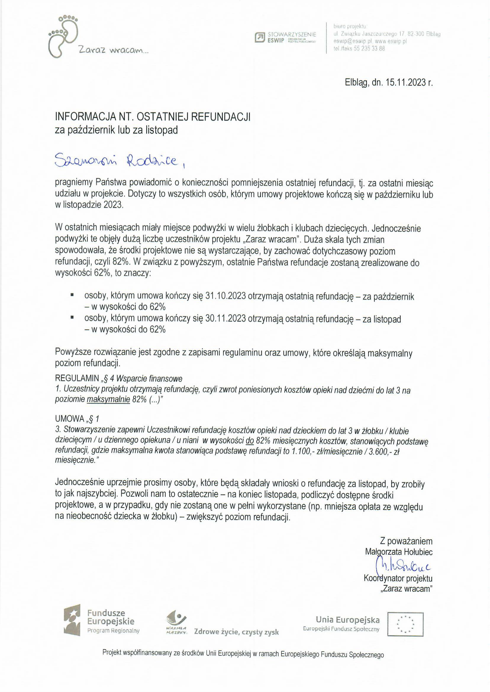 Szanowni Rodzice, w związku ze zbliżającym się zakończeniem projektu "Zaraz wracam", prosimy o zapoznanie się z informacją na temat ostatniej refundacji.