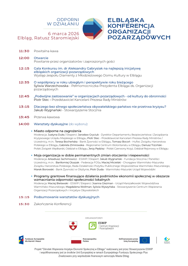 Głównym tematem rozmów podczas Elbląskiej Konferencji Organizacji Pozarządowych będzie budowanie odporności społecznej. Pod tym pojęciem kryje się zdolność nas wszystkich - jako mieszkańców i sąsiadów - do współpracy oraz radzenia sobie w trudniejszych sytuacjach. Za najważniejszy filar tej odporności uznaje się silne organizacje pozarządowe, które są najbliżej ludzkich spraw i najlepiej znają potrzeby lokalnej społeczności.