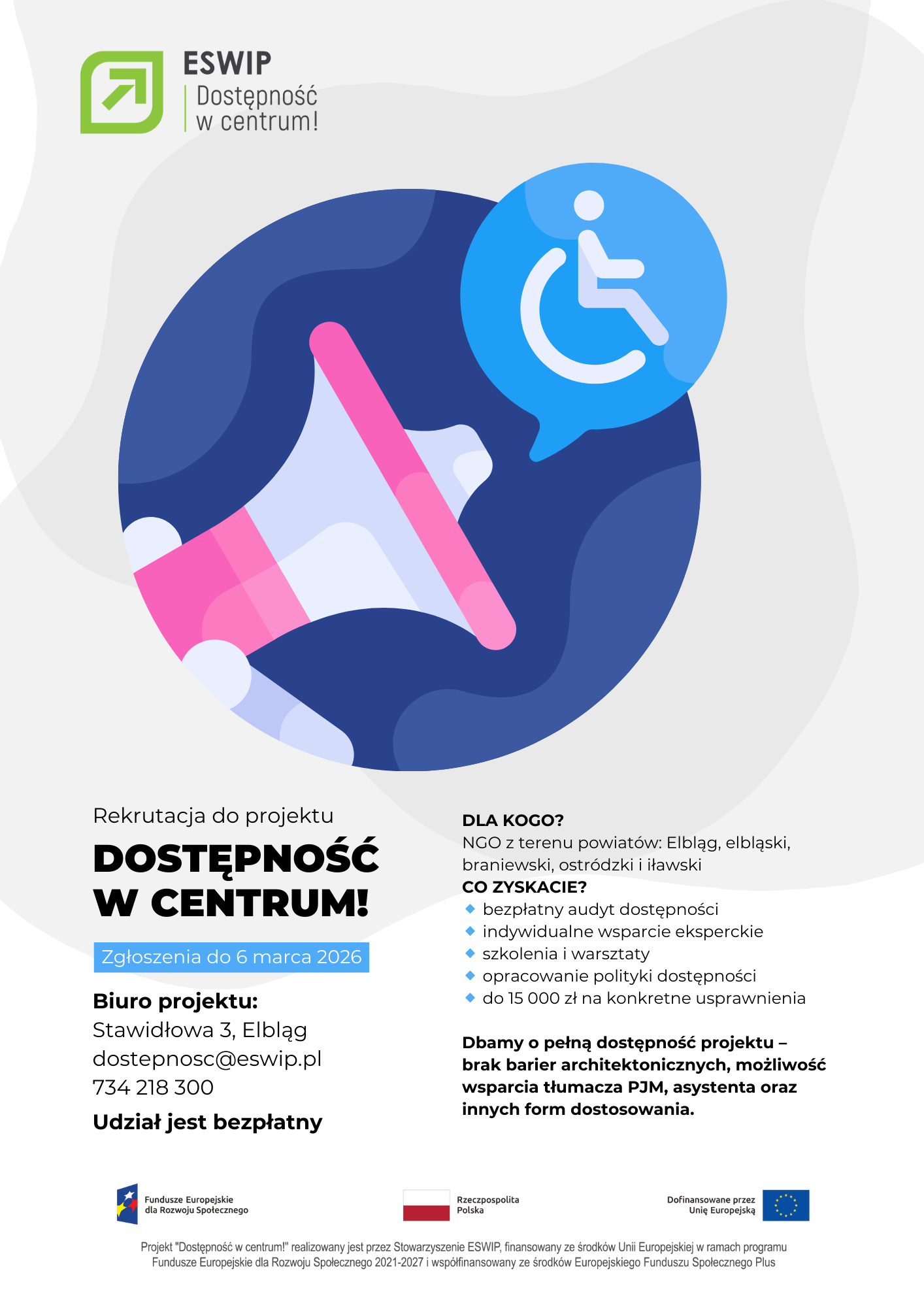 Elbląskie Stowarzyszenie Wspierania Inicjatyw Pozarządowych zaprasza NGO z województwa warmińsko-mazurskiego (powiaty: Elbląg, elbląski, braniewski, iławski, ostródzki) do udziału w projekcie „Dostępność w centrum!” realizowanym w ramach programu Fundusze Europejskie dla Rozwoju Społecznego 2021–2027. Termin zgłoszeń: do 6 marca 2026 r.