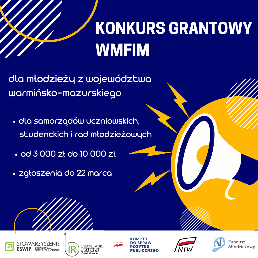 Ogłaszamy nabór wniosków o przyznanie małych grantów na realizację projektów służących aktywizacji osób w wieku 15-29 lat w organizacjach młodzieżowych w ramach Funduszu Grantowego i projektu „Warmińsko-Mazurski Fundusz Inicjatyw Młodzieżowych", realizowanego wspólnie ze Stowarzyszeniem Braniewski Instytut Rozwoju