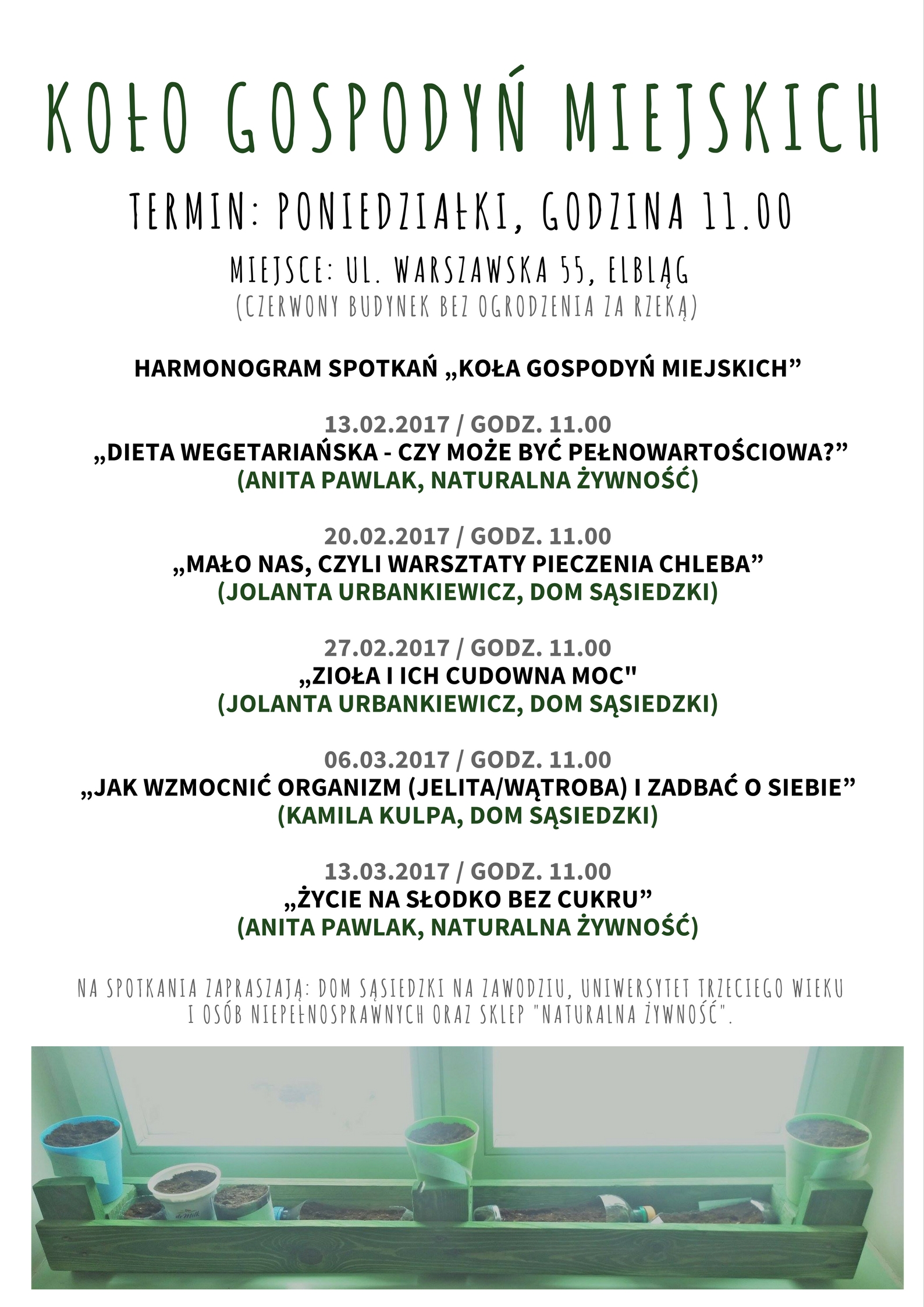 „Zaczynamy od tradycyjnych, naturalnych pomysłów na kuchnię – wyjaśniają organizatorzy - najbliższe dwa miesiące upłyną pod hasłem dbania o siebie w szerokim ujęciu. Podczas pierwszego spotkania o zimowych bombach witaminowych na talerzu na parapetach Domu pojawiły się doniczki z ziołami i kiełkowniki. Przed nami spotkania z ekspertami sklepu Naturalna Żywność w temacie m.in. bilansowania diet wegetariańskich i wegańskich, pasjonatami ziół czy naturalnego oczyszczania organizmu, a także wprawki w wyciszaniu i medytacji. Na spotkania, które odbywają się zazwyczaj w poniedziałki o godz. 11.00 w siedzibie Domu Sąsiedzkiego na ul. Warszawskiej 55 zapraszamy absolutnie wszystkich bez wyjątku. Spotkania Koła Gospodyń Miejskich są otwarte i chętnie ugościmy każdą przybyłą osobę.