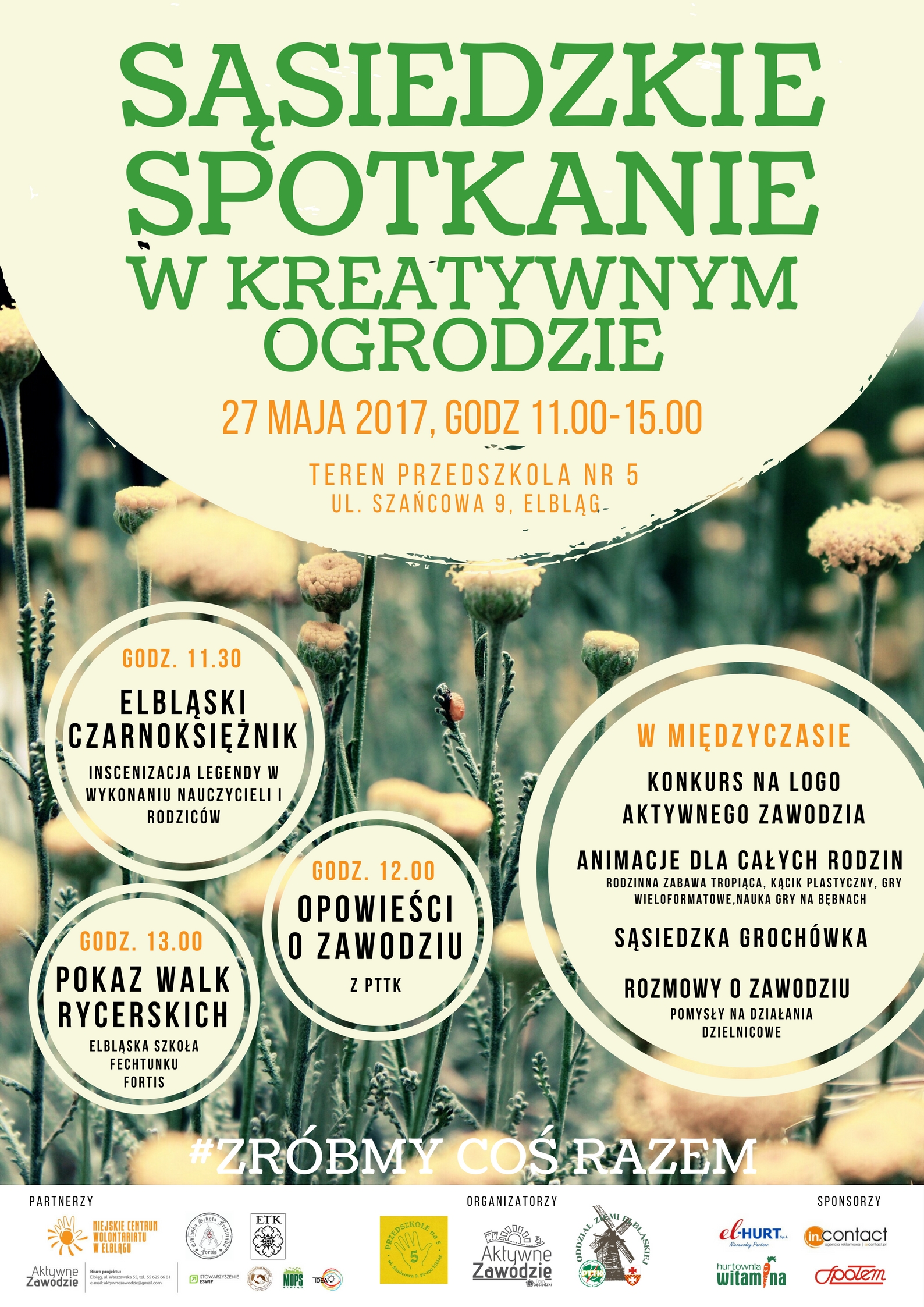 Organizatorzy zapraszają do wspólnej zabawy i czekają w sobotę w Kreatywnym Ogrodzie na terenie Przedszkola Nr 5 na Zawodziu, ul. Szańcowa 9 w Elblągu. Jednocześnie dziękują wszystkim partnerom oraz sponsorom za wsparcie i zaangażowanie w realizację działania.