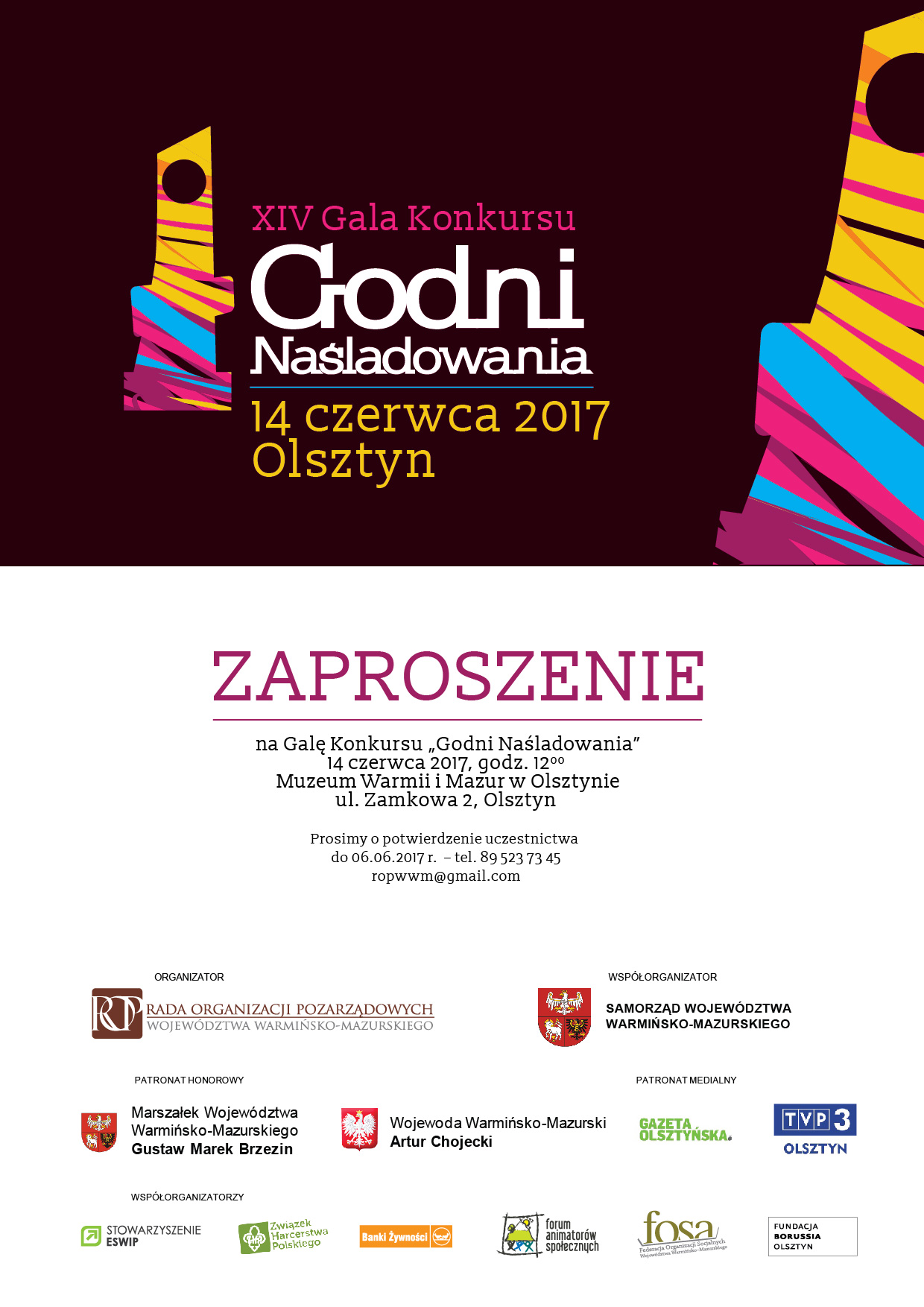 14 czerwca 2017, o godz. 12:00 w Muzeum Warmii i Mazur, przy ul. Zamkowej 2 w Olsztynie odbędzie się Gala Konkursu "Godni Naśladowania".