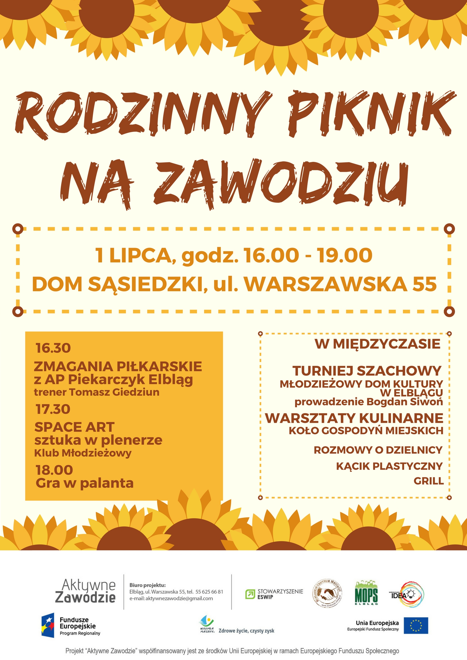„Na miejscu na wszystkich czekał będzie grill z kiełbaskami, zatem zachęcamy do przynoszenia ze sobą sałatek czy ciast na wspólny piknikowy stół. - informują organizatorzy - W trakcie imprezy prowadzone będą zajęcia piłkarskie z AP Piekraczyk Elbląg, warsztaty kulinarne pod okiem pań z Koła Gospodyń Miejskich, a także Turniej Szachowy połączony z nauką gry w szachy, nad którym czuwał będzie Pan Bogdan Siwoń z Młodzieżowego Domu Kultury w Elblągu.”